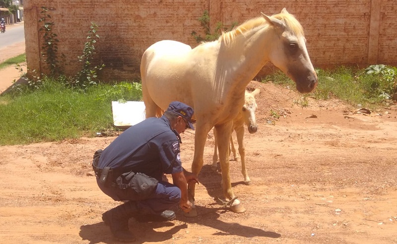 Uma égua com filhote pequeno bloquearam o trânsito de veículos e ofereceram riscos de acidente na manhã de domingo (12), na Avenida José Bonifácio, na divisa dos bairros São Miguel e Santa Luzia.