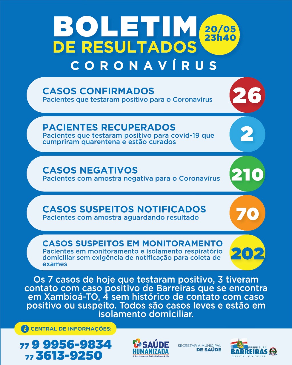 BARREIRAS: BOLETIM INFORMATIVO, SOBE PARA 26 CASOS CONFIRMADOS PARA O COVID-19 E 202 EM MONITORAMENTO DOIS PACIENTES FORAM RECUPERADOSQuinta-feira, 21 de Maio de 2020 / Região