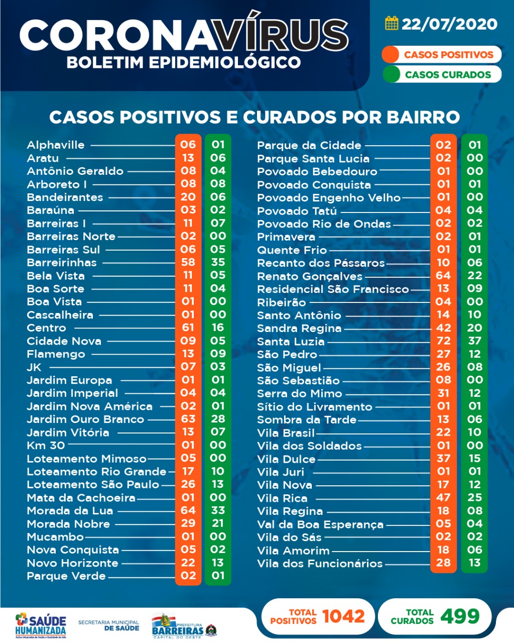 Barreiras contabiliza hoje 5.908 (cinco mil novecentos e oito) casos notificados, sendo que o primeiro caso notificado no Sistema e-SUS VE foi em 26 de março de 2020. E 1.042 (um mil e quarenta e dois) casos descartados, cujos resultados foram negativos. De acordo com orientações recentes do Sistema e-SUS VE, o número total de notificados poderá sofrer variações em função de descartes de casos com sintomas gripais.