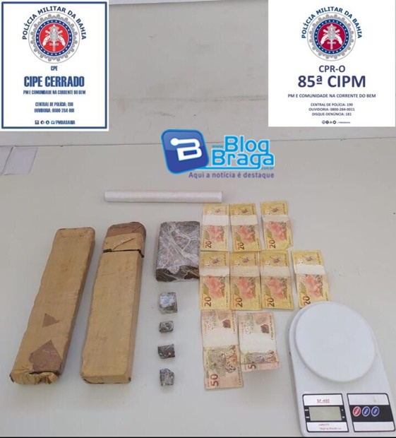 Com os abordados foram encontrados tabletes de substância análoga a maconha, porções fracionadas de mesma droga, material para embalagem, dinheiro e balança de precisão.