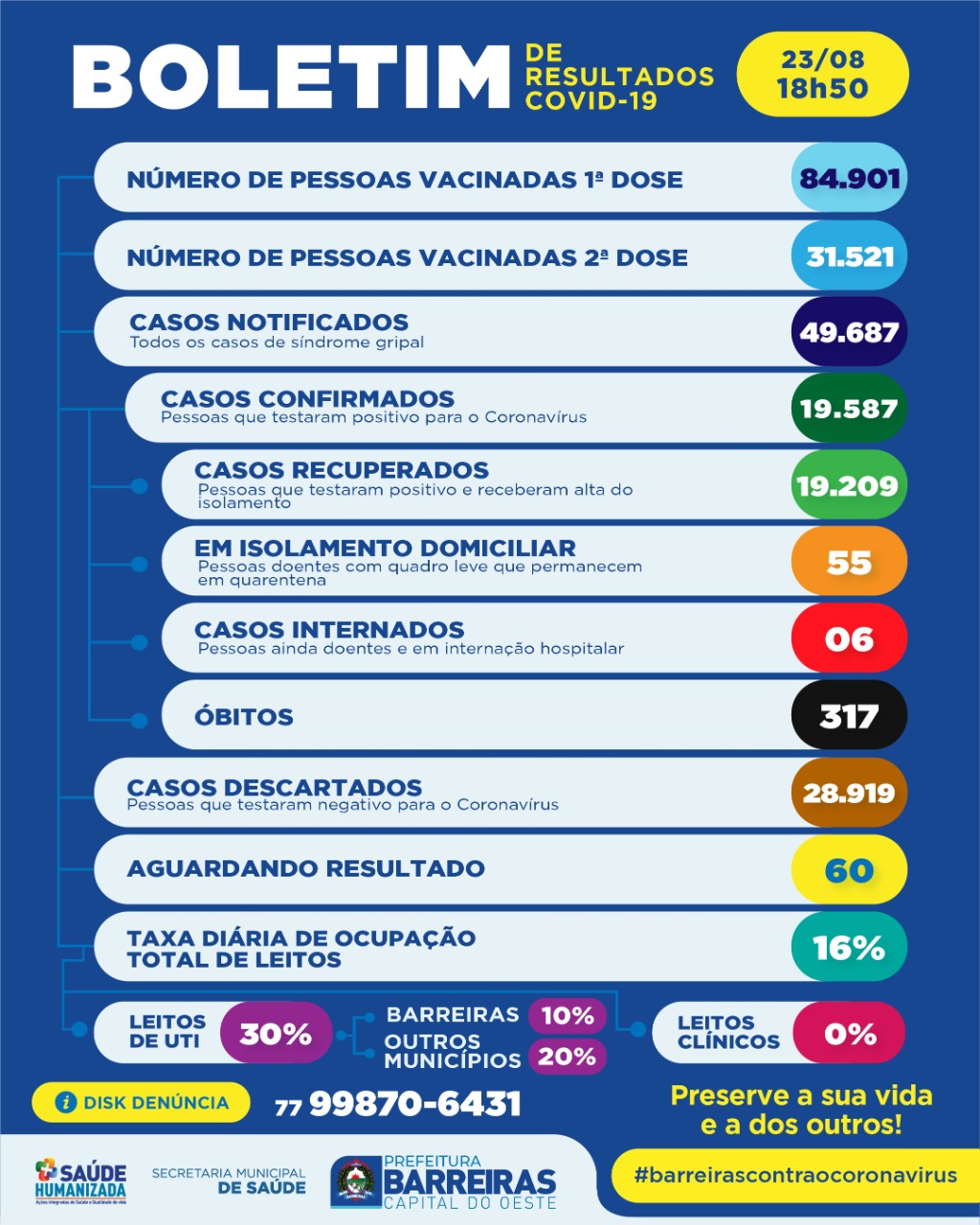 Barreiras registra atualmente 19.587 (dezenove mil quinhentos e oitenta e sete) casos confirmados por Teste Rápido e RT-PCR. Destes, 19.209 (dezenove mil duzentos e nove) estão recuperados, 55 (cinquenta e cinco) estão em isolamento domiciliar, 06 (seis) pacientes estão internados e o município registra 317 (trezentos e dezessete) óbitos. Já os casos que aguardam resultado somam 60 (sessenta).