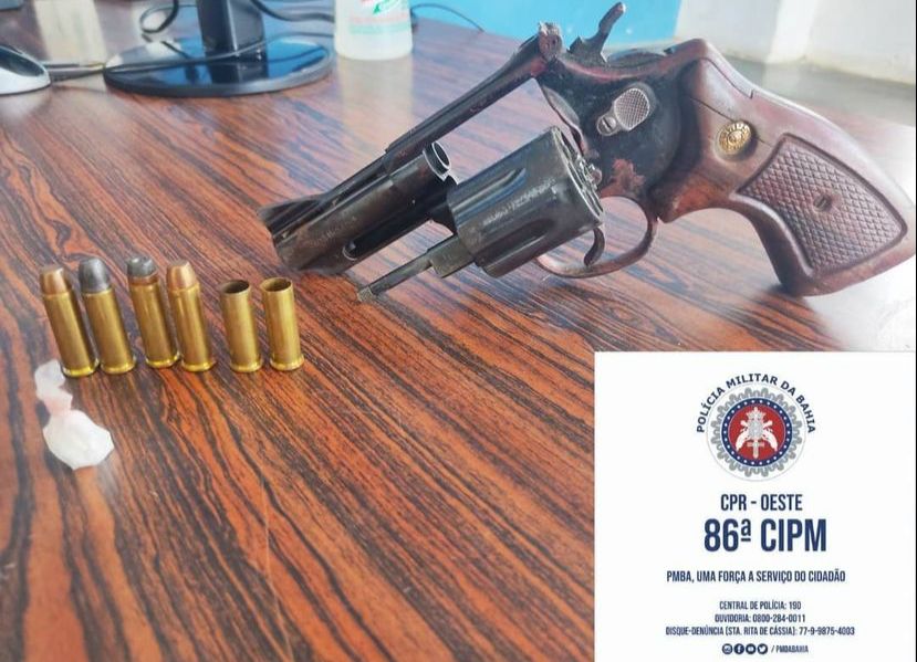 Com o indivíduo foi encontrado um revólver calibre .38, com 6 munições, sendo 4 intactas e 2 deflagradas, além de uma pequena “peteca” de cocaína.